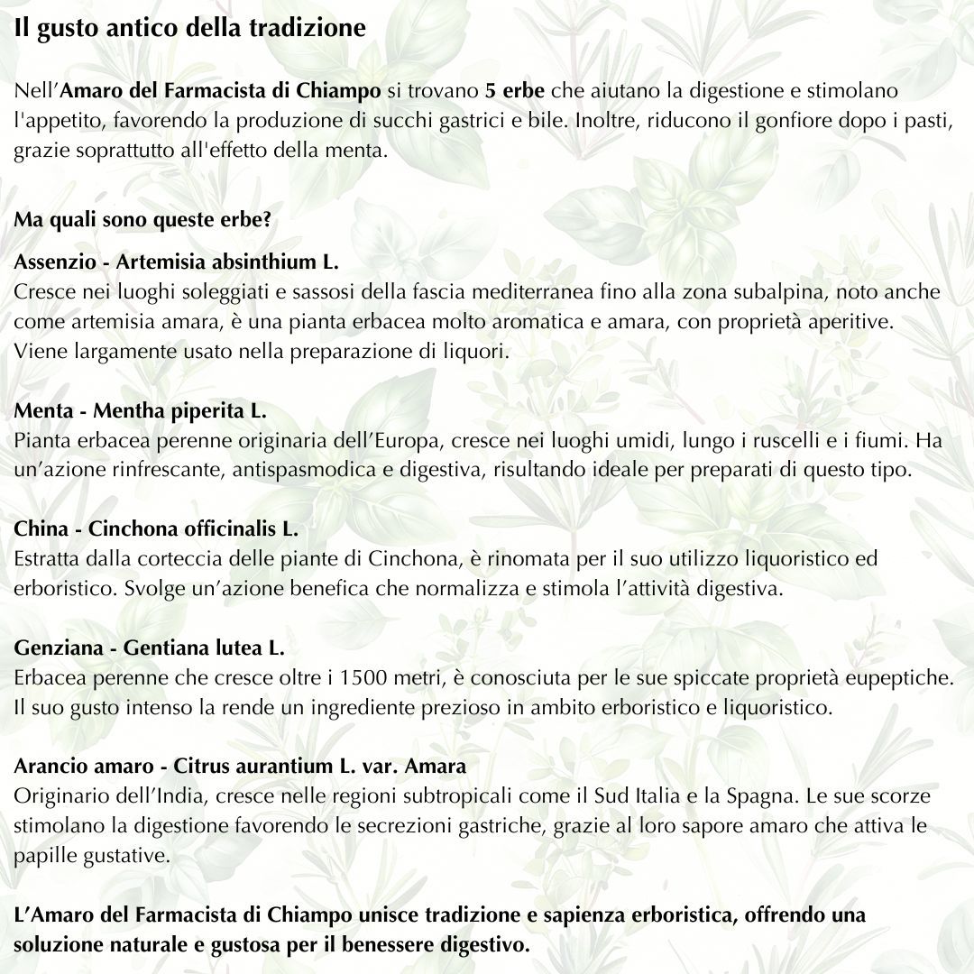 L’Amaro del Farmacista di Chiampo è formulato seguendo la ricetta tradizionale dei monaci benedettini, utilizzando una selezione di erbe dalla comprovata azione digestiva.